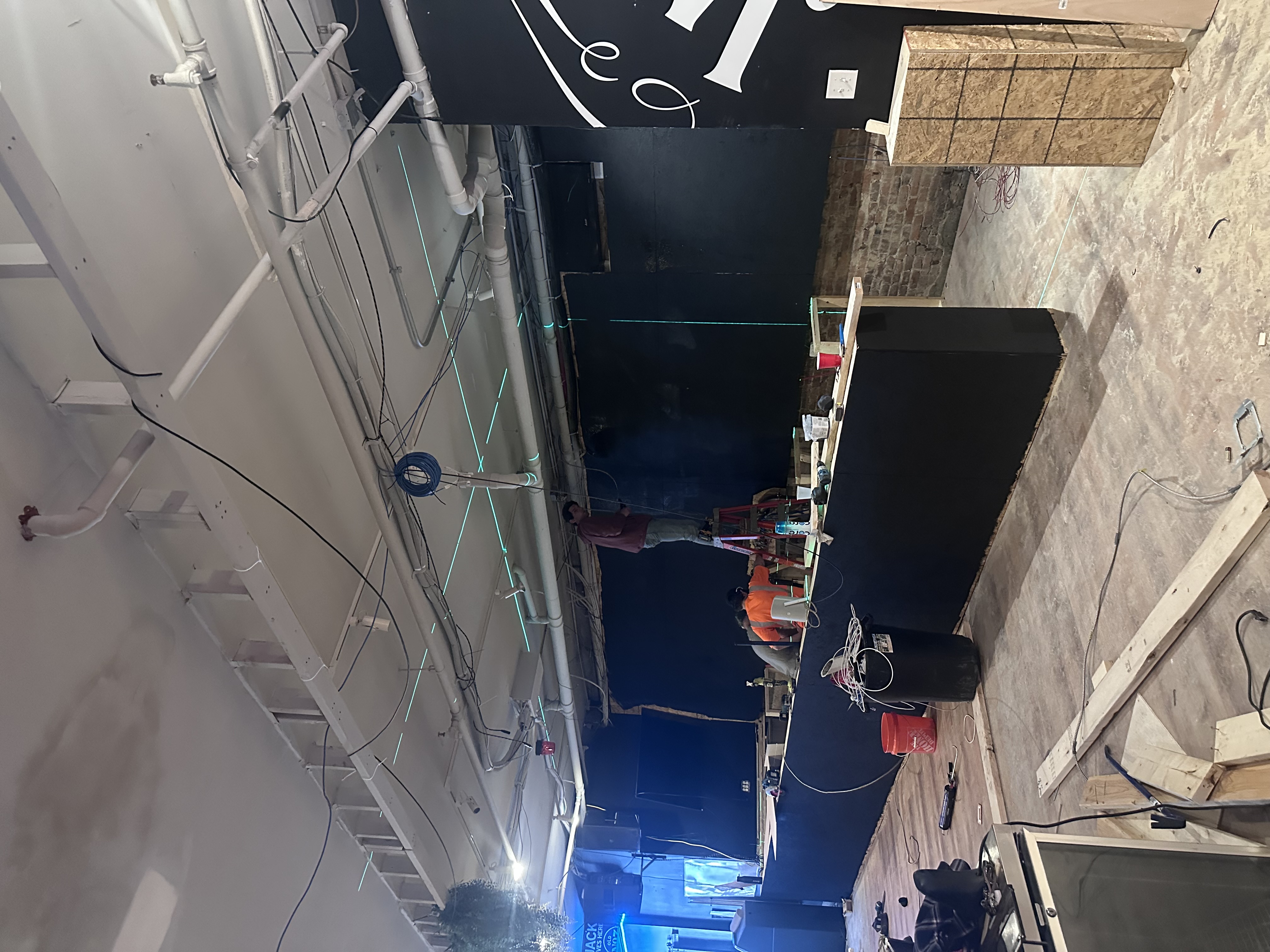 We removed the existing bar and built a new custom bar and accent walls.